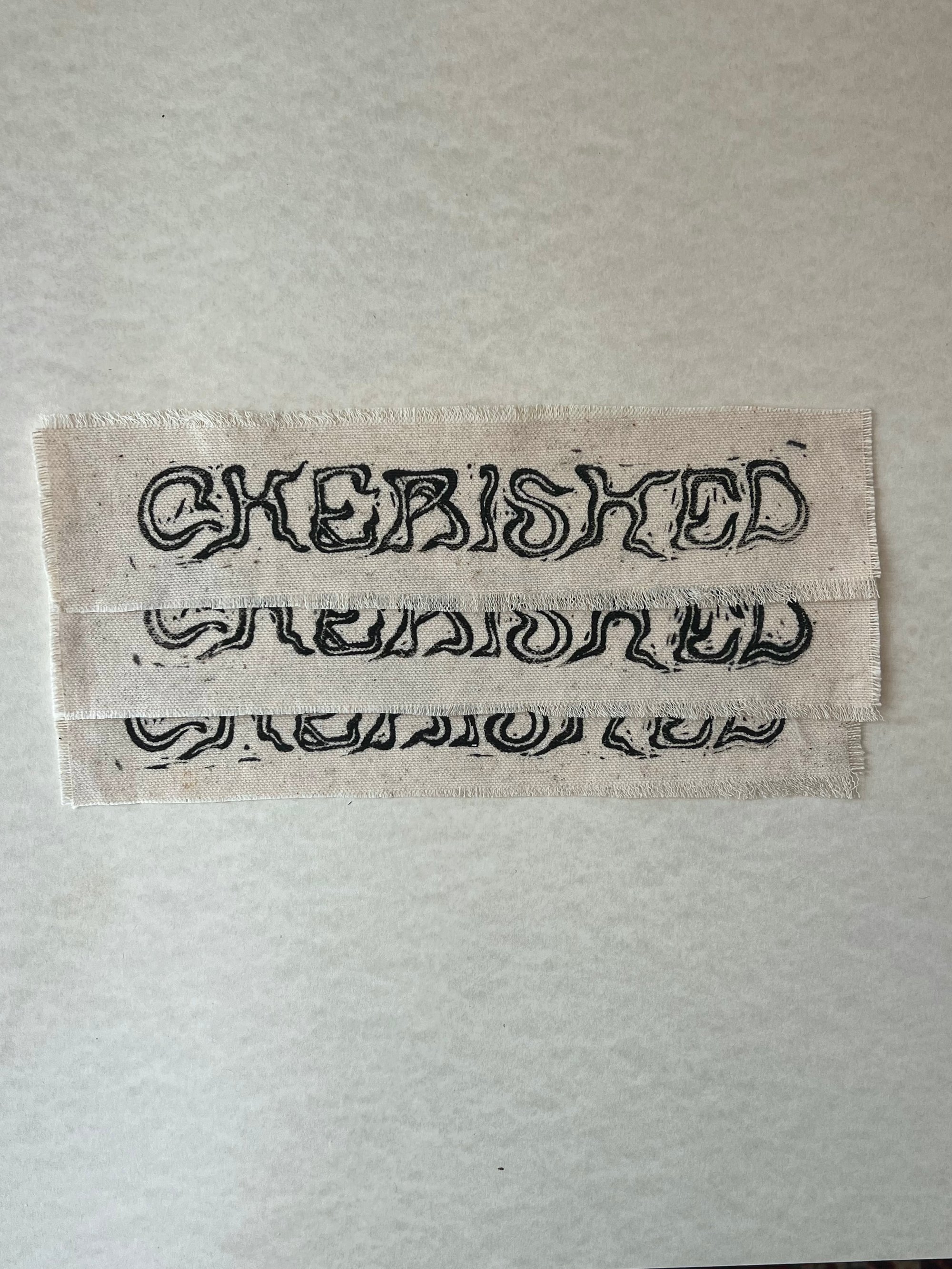 2”x9.5” black ink linocut design printed on medium weight canvas