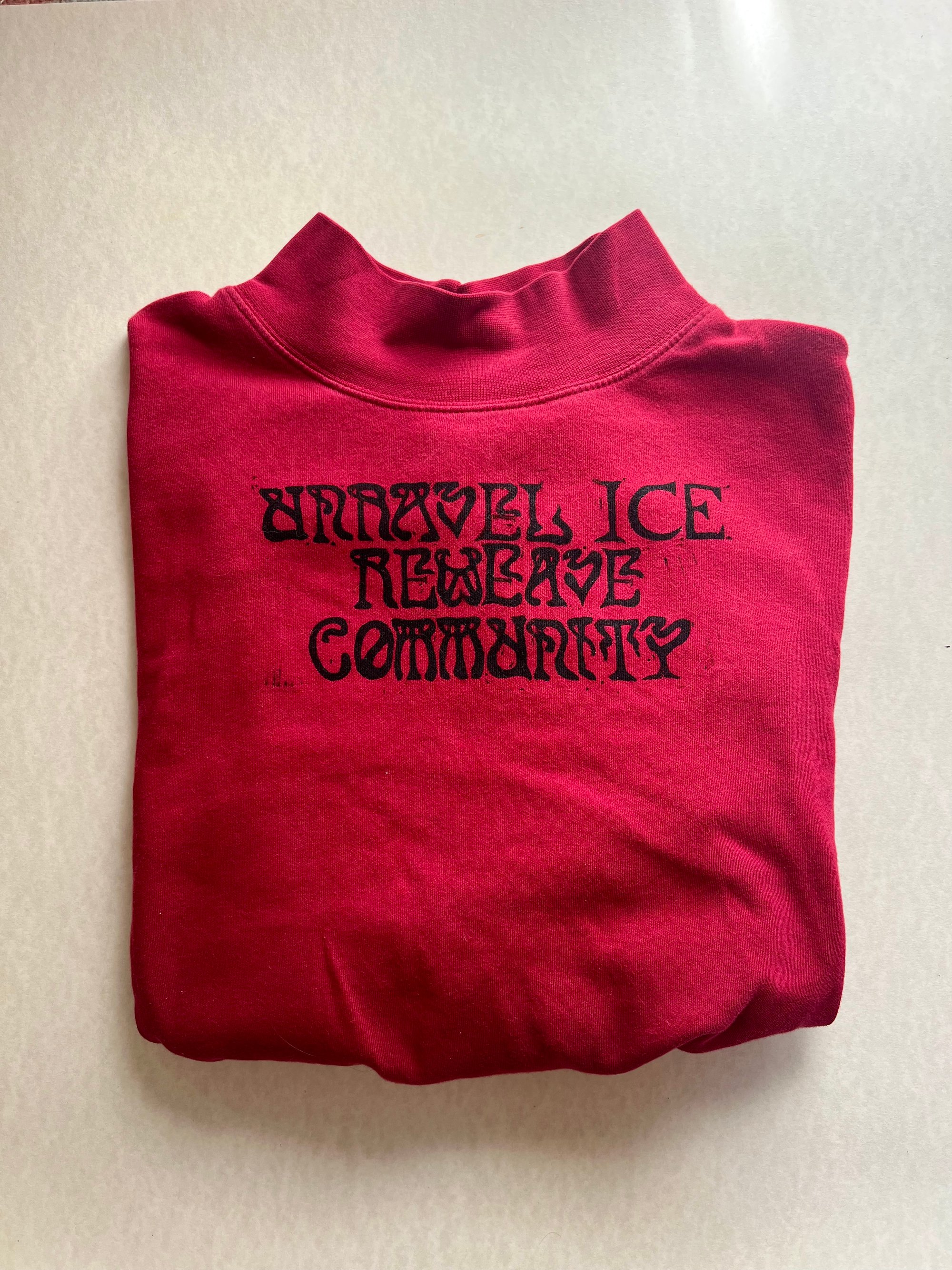 Red “Unravel ice reweave community” long sleeve turtle neck (s/m)